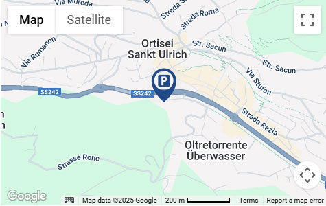 La posizione strategica e centrale del parcheggio è il vero punto di forza. Il parcheggio si trova presso la cabinovia Ortisei-Alpe di Siusi e attraversando il ponte che collega il parcheggio al centro di Ortisei si raggiunge in 2 minuti (150m) la zona pedonale di Ortisei, la piazza Stetteneck, piazza della chiesa e piazza Sant’Antonio.